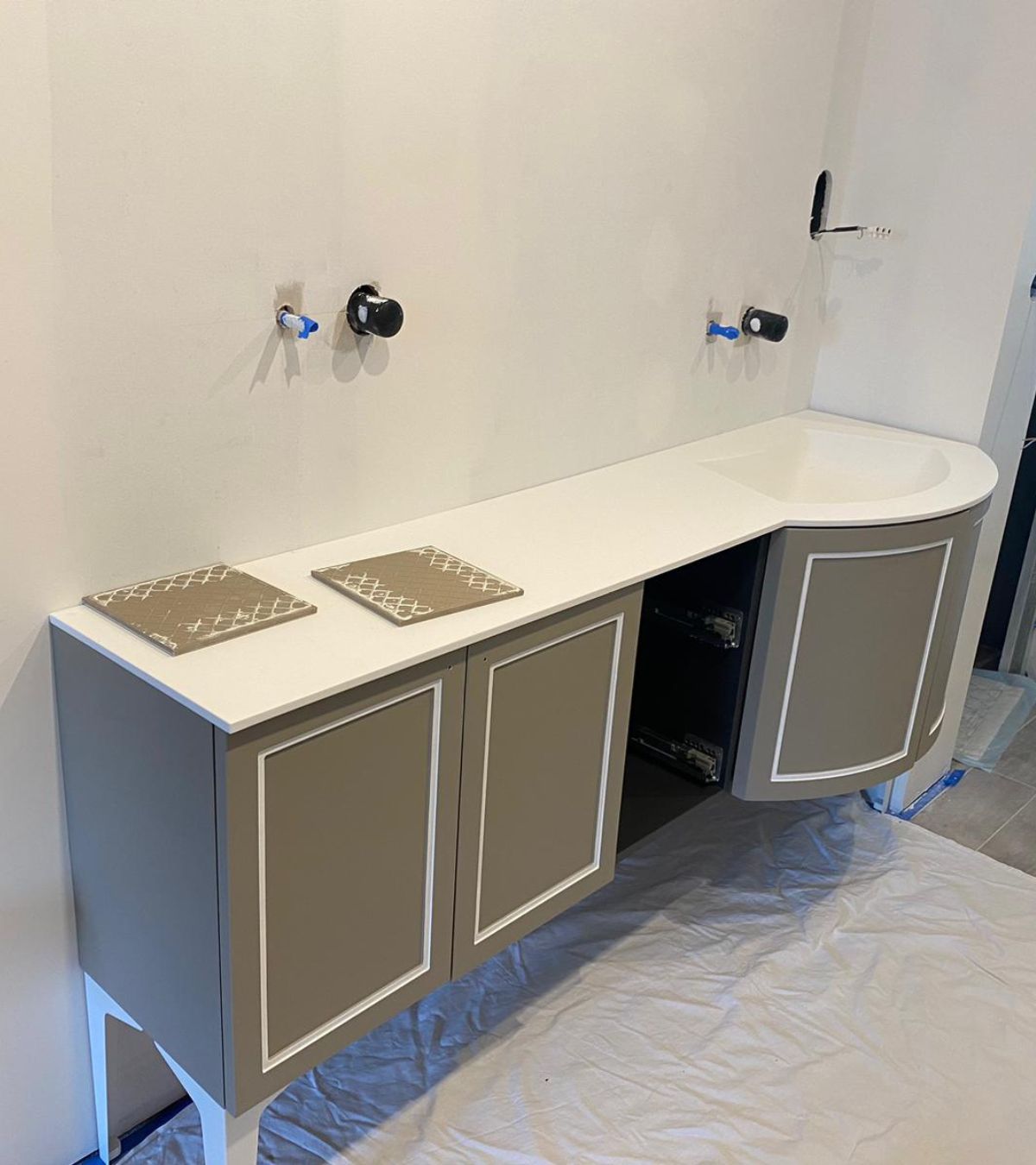 Sophie désirait un meuble « chic », aux courbes féminines, avec du rangement. Franck, qui est très grand, voulait une grande vasque, assez haute par rapport au sol et surtout ne pas se cogner les genoux au meuble, tout en ayant un peu de rangement…