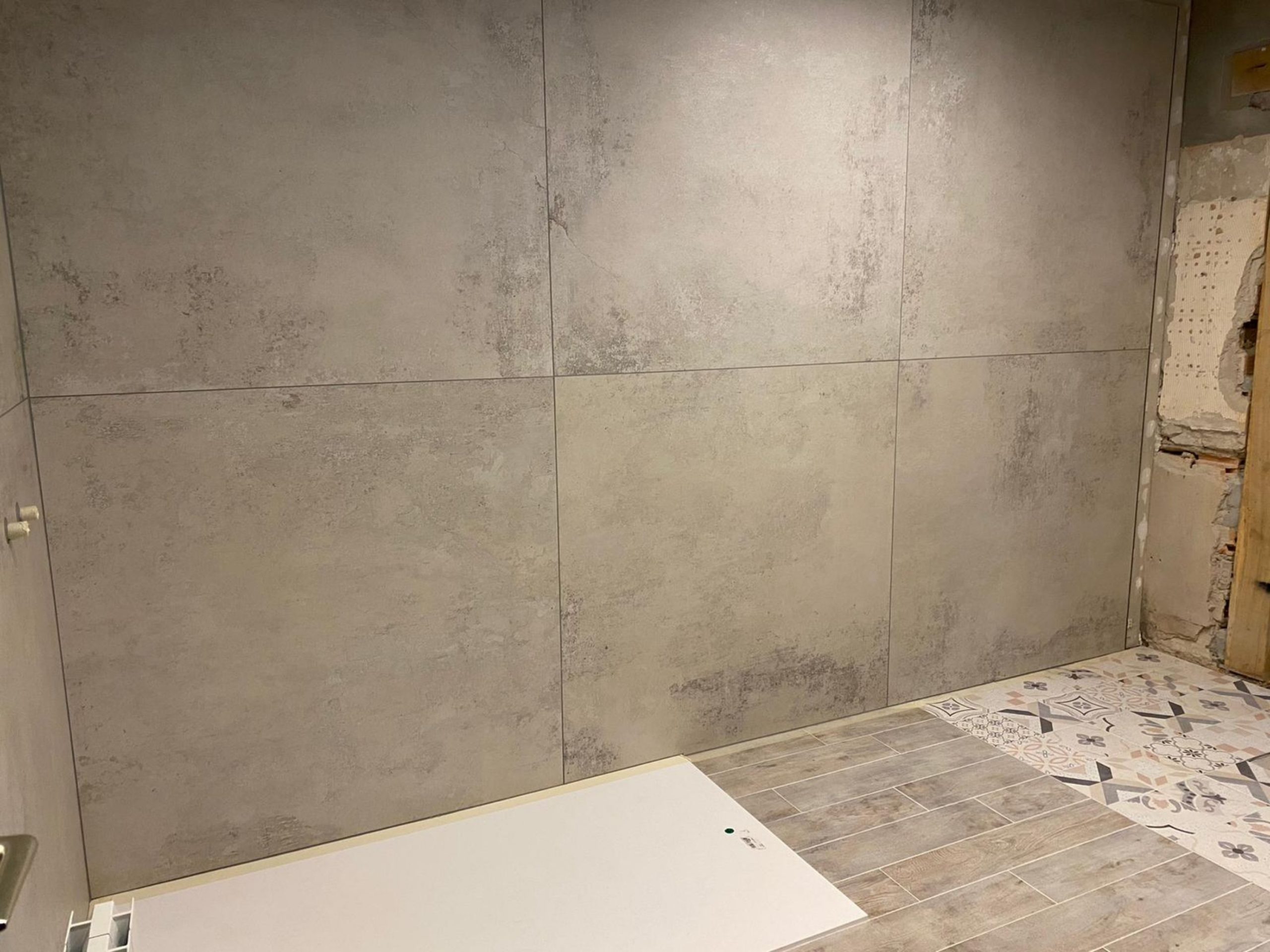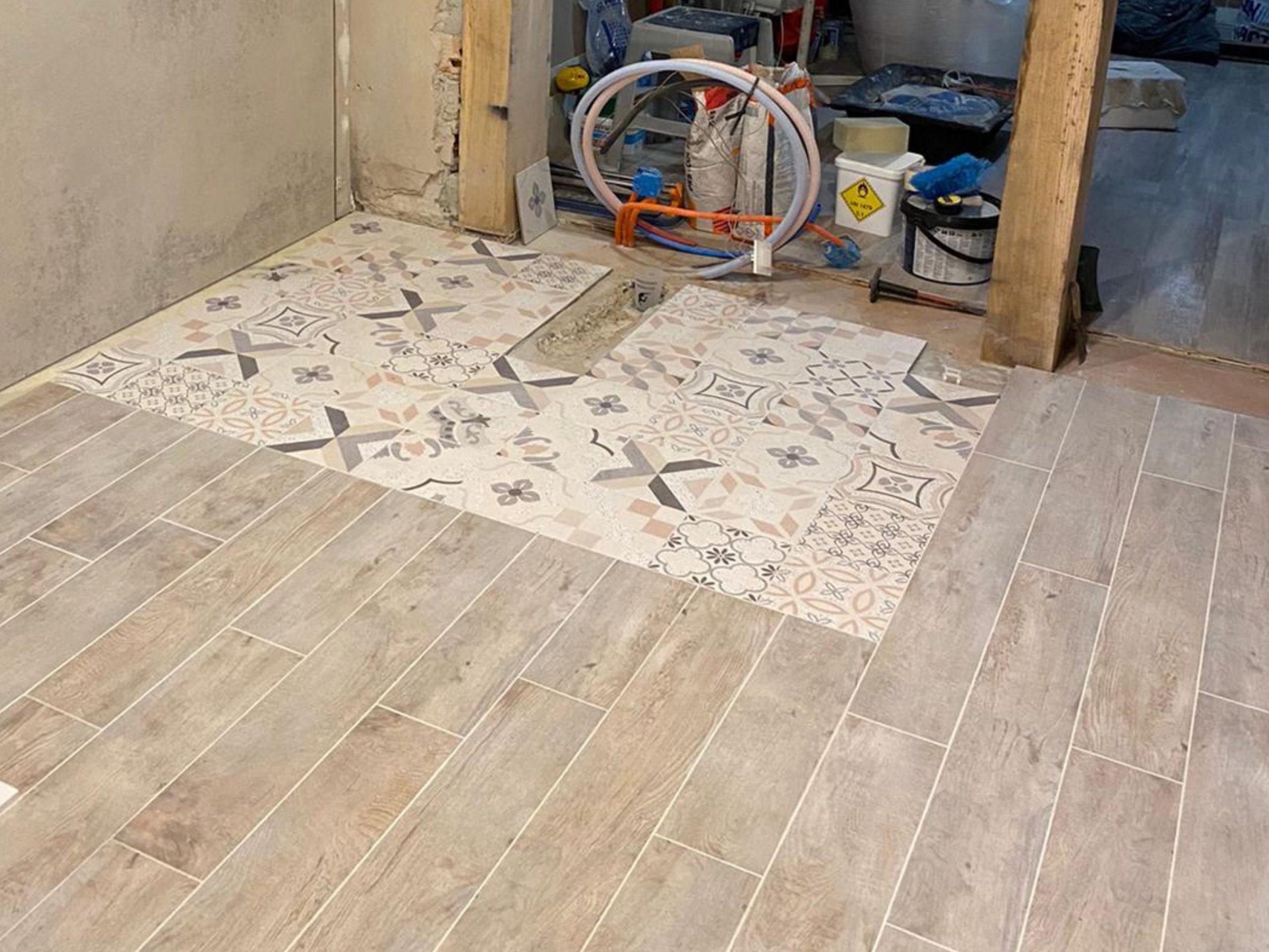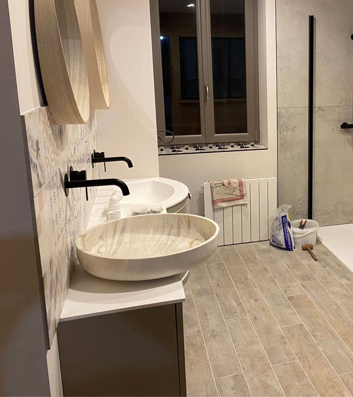 Au sol, nous avons délimité l’espace baignoire avec un carrelage style « carreaux ciment », et sur le reste, nous avons choisi du carrelage « bois », ce qui a tout de suite rendu la salle de bain plus accueillante.