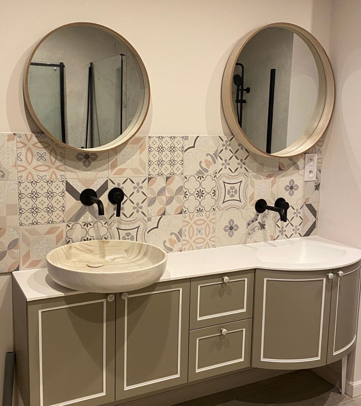 Du côté de Franck, une partie du meuble rétrécie en profondeur et on a choisi une magnifique grande vasque à poser en Corian® Dune de Rexa Design, avec des effets marbrés d’une jolie couleur beige qui se marie à la fois avec la couleur de la façade laquée « Canapa Mat » du magnifique meuble « vintage » et que l’on retrouve, par touches sur le carrelage de la crédence.