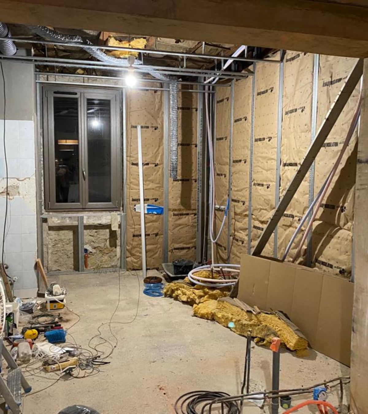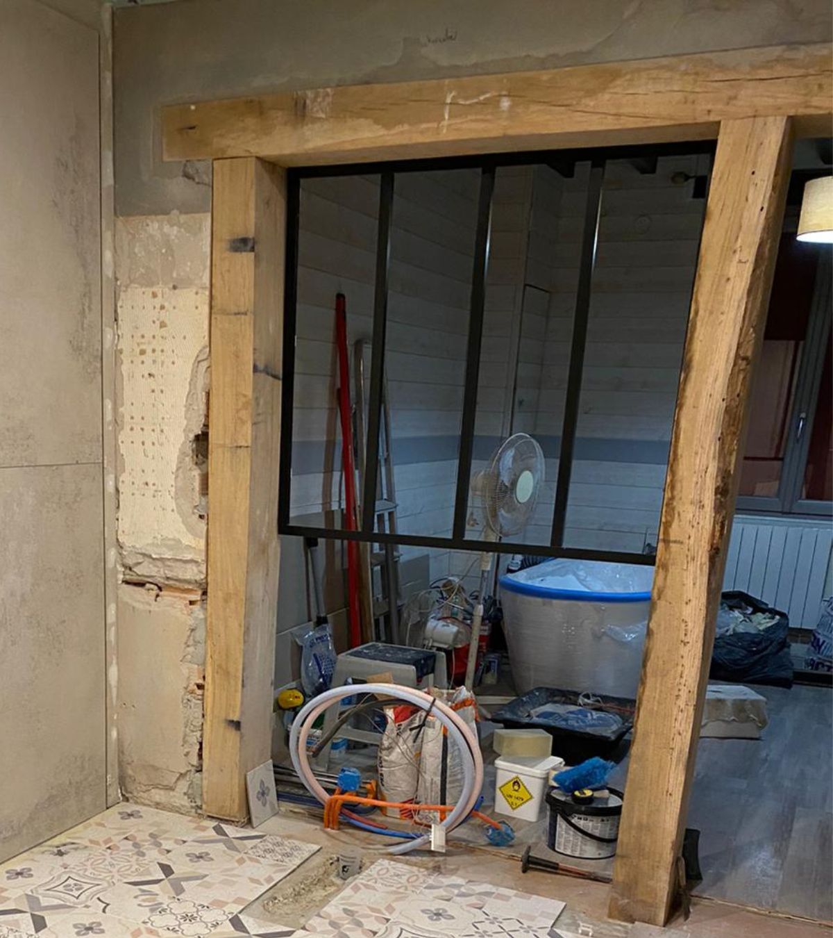 Le mur du fond, qui faisait office de séparation avec la chambre parentale a été supprimé pour profiter de l’espace et de la lumière. Un muret a été intégré à sa place sur laquelle repose une structure en bois massif et une verrière de type « atelier ».